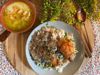 Supa acra de pui/Pulpe dezosate cu orez cu legume si sos de ciuperci