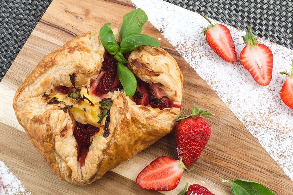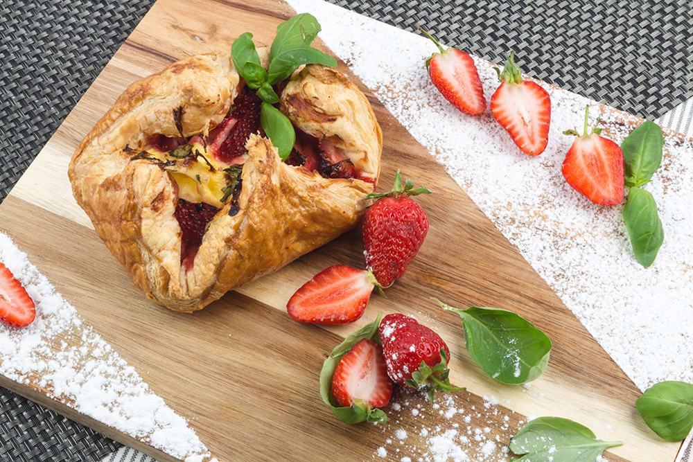 Foietajul se intinde dupa care se umple cu budinca preparata si capsuni proaspete. Se coace la cuptor iar la final se serveste cu zahar pudra si busuioc.