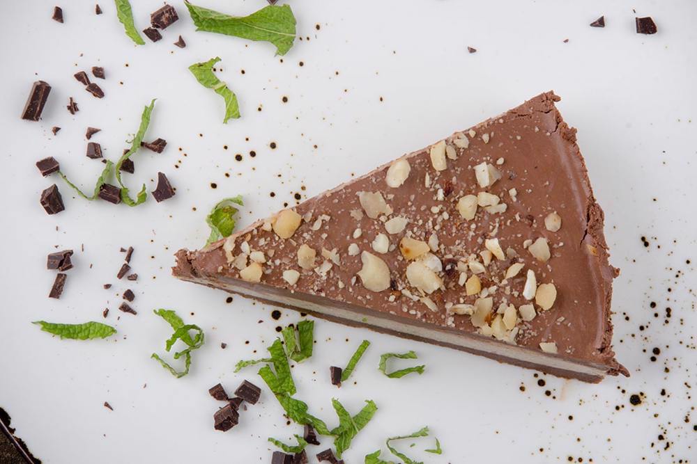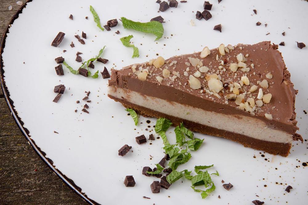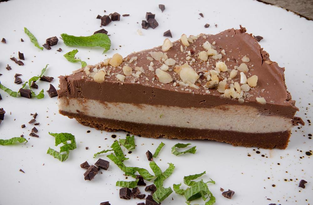 Se maruntesc biscuitii impreuna cu untul si cacao, se pune intr-o tava cu fundul detasabil. Se fierbe frisca cu alunele. Se topeste ciocolata cu frisca si unt.