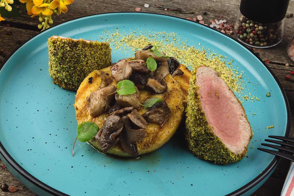 Malaiul se fierbe in apa, lapte si unt, se pune la racit si ulterior se prajeste pe grill. Muschiul de porc se pune la prajit si apoi in cuptor, iar la final se unge cu musar dijon si se da prin fisticul macinat. Ciupercile se soteaza in unt si usturoi.